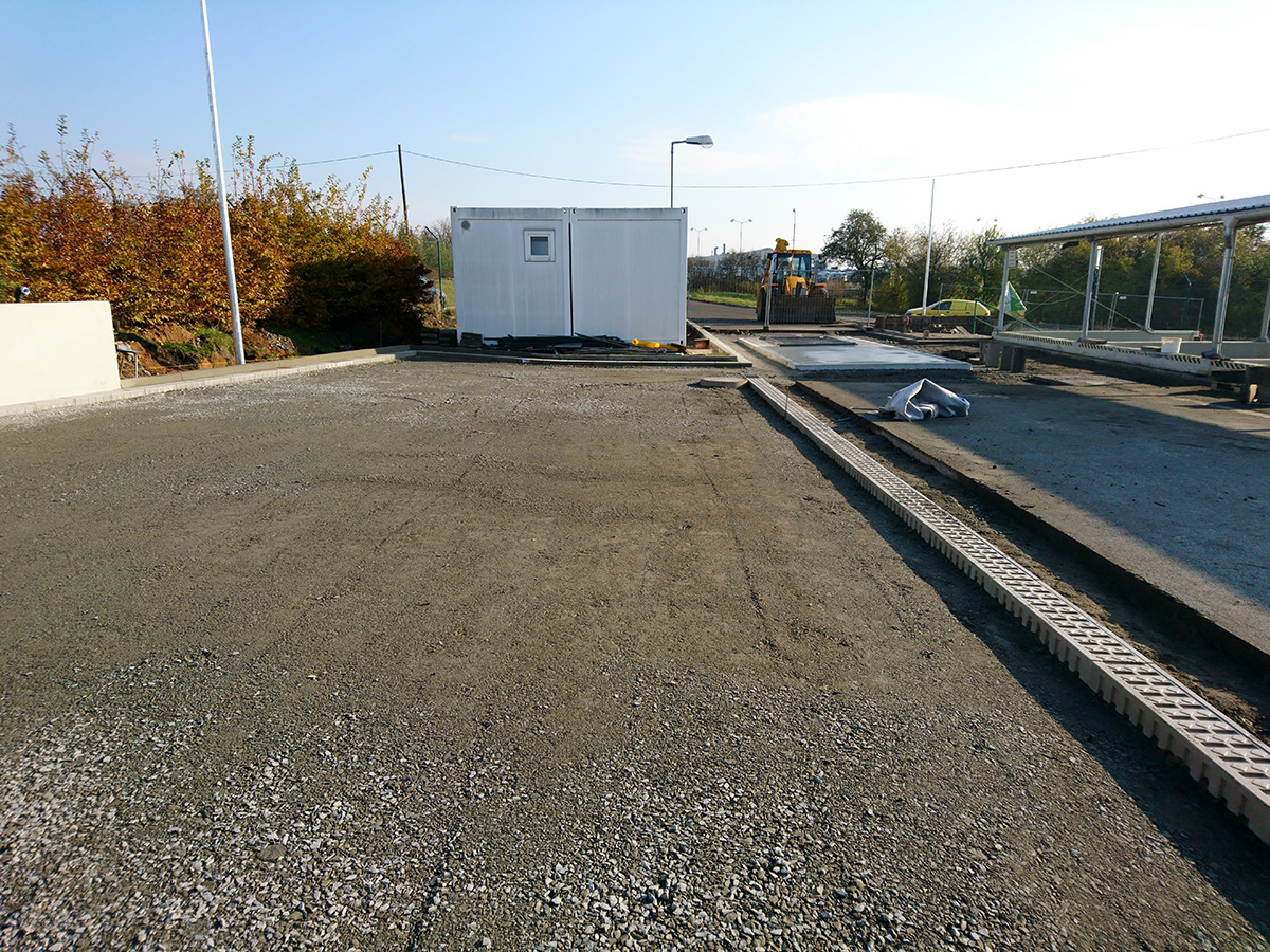 Zpevněná skladovací plocha z asfaltového povrchu. Součástí stavby bylo vybudování přístřešku pro kontejnery, parkovacích ploch, areálové komunikace a dodání silniční váhy.